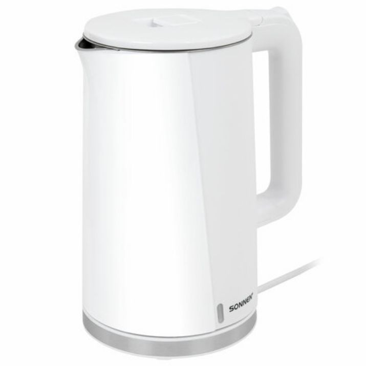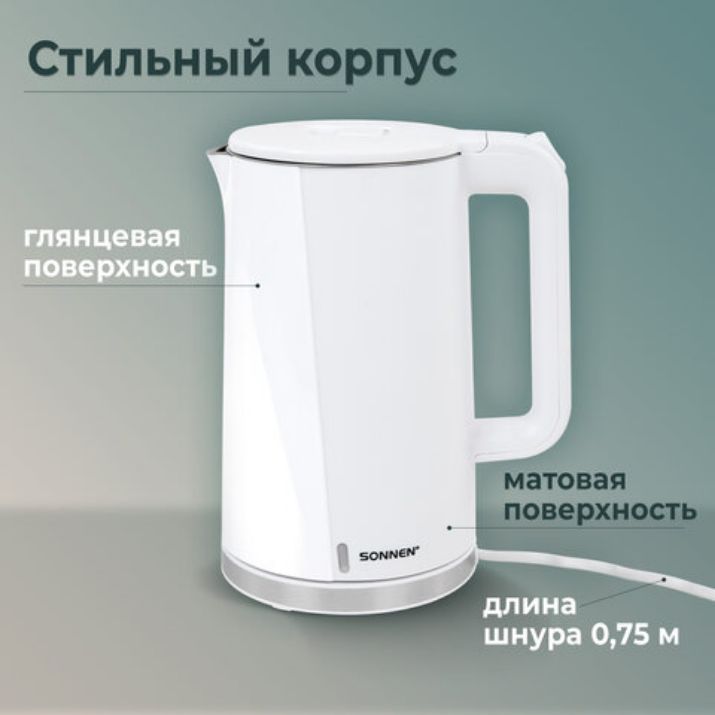 Чайник электрический с двойными стенками SONNEN KT-8718W, 1,7 л, 2200 Вт, белый, 454685