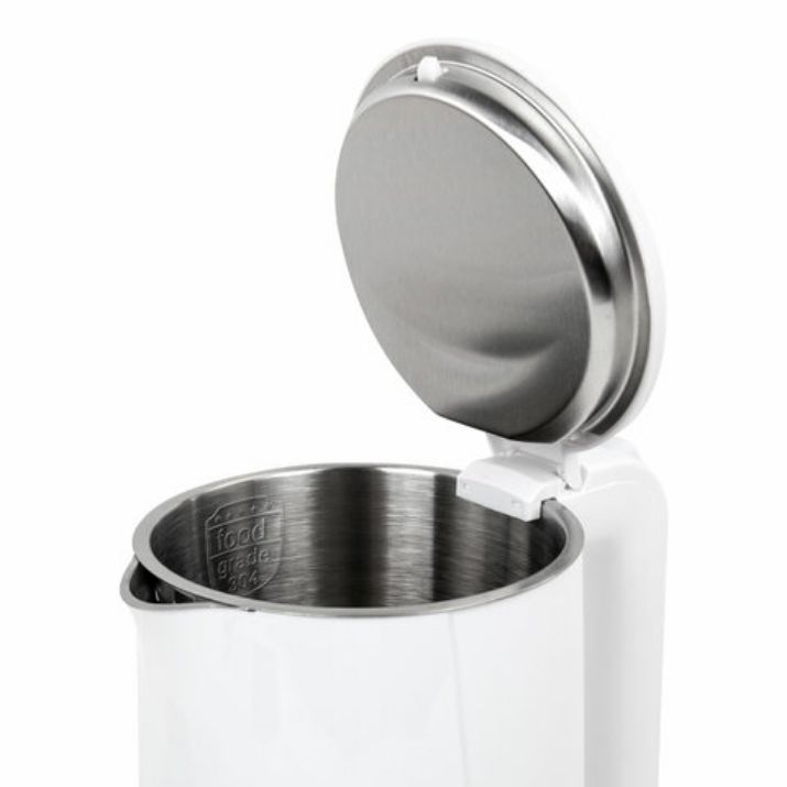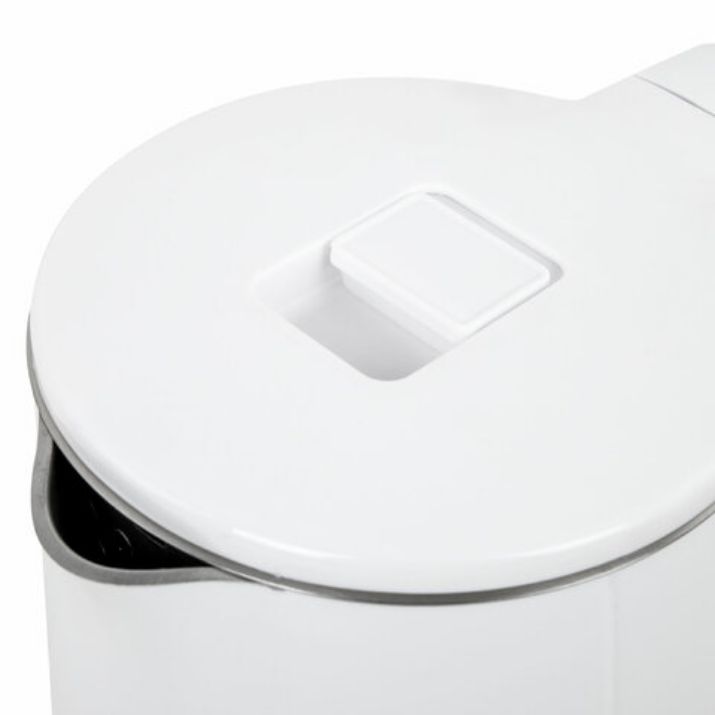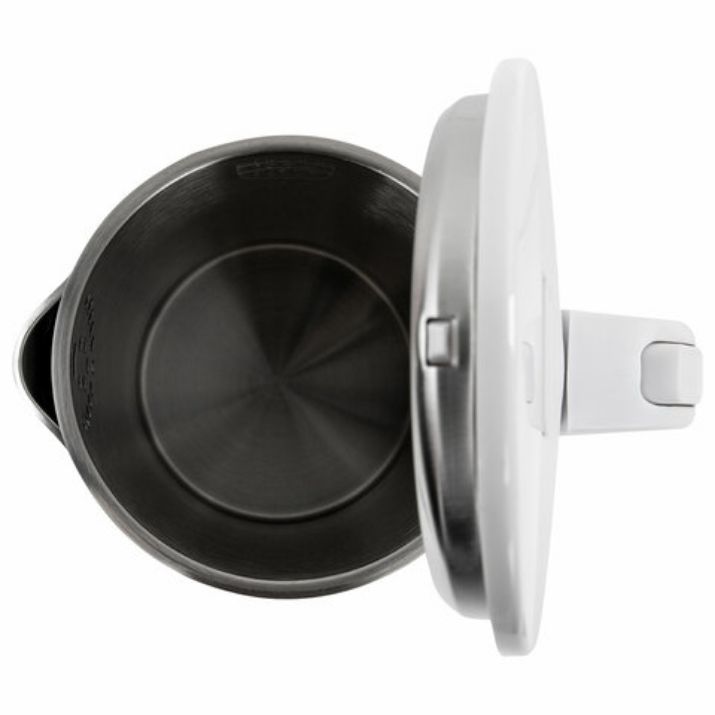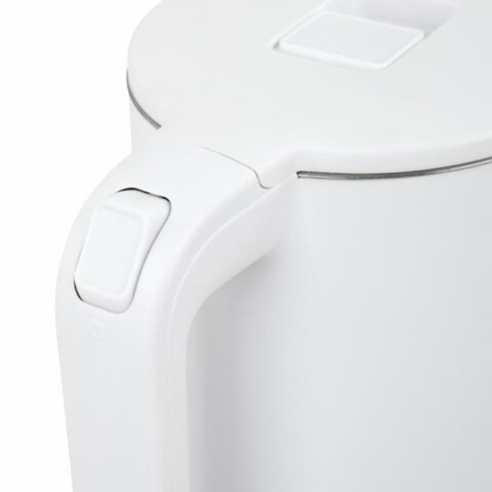 На крышке чайника находится кнопка открывания, что делает его удобным в эксплуатации. Чайник имеет адиабатный корпус: внутренняя колба сделана из нержавеющей стали, внешнее покрытие – из термостойкого пластика. Благодаря такому корпусу чайник дольше сохраняет тепло.