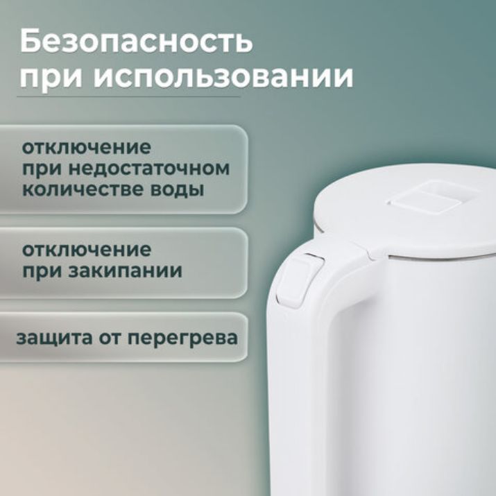 Чайник безопасен при использовании, так как имеет автоотключение при недостаточном количестве воды и защиту от перегрева.