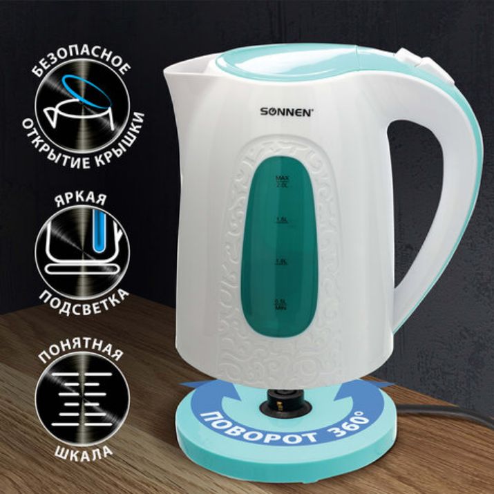 Благодаря своему дизайну и необычному узору на корпусе, электрический чайник SONNEN KT-2016 отлично подойдет для дома и офиса.