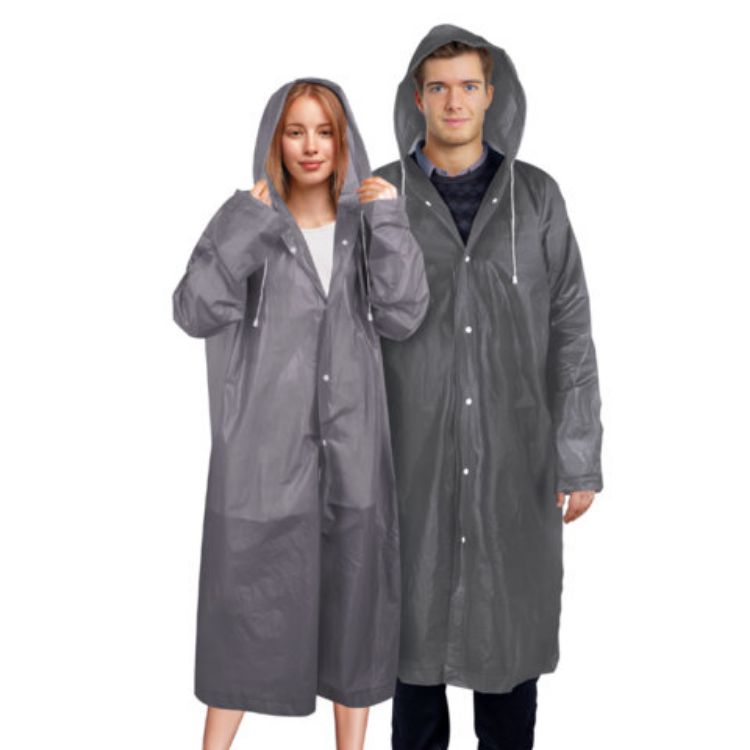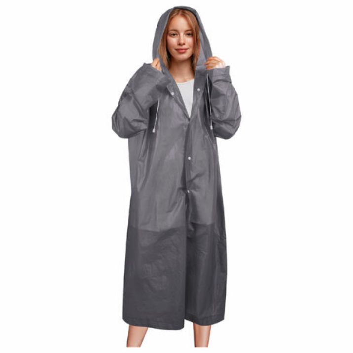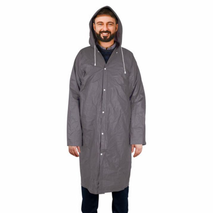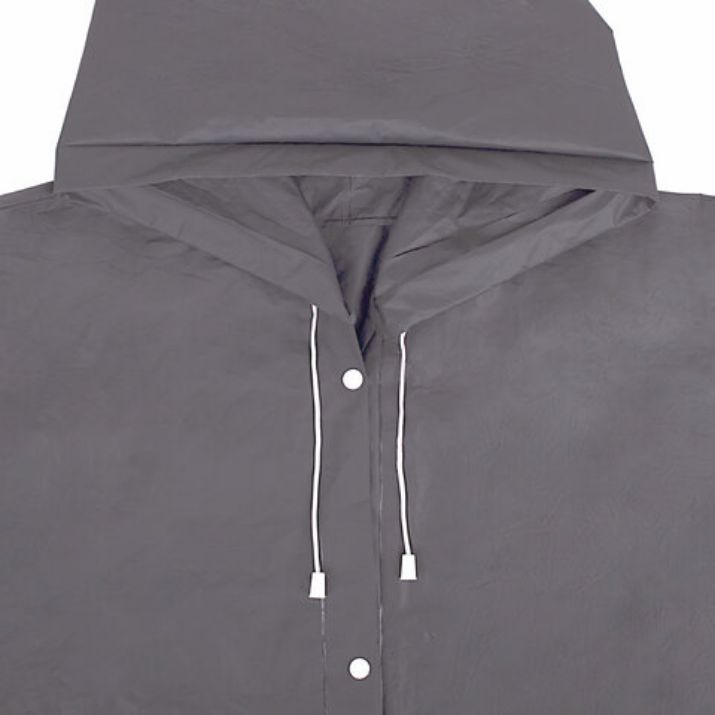Дождевик-плащ универсального размера с капюшоном изготовлен из этиленвинилацетата (EVA). Поверхность дождевика рельефная. Застегивается на 6 пар кнопок из полипропилена (PP). В капюшоне есть кулиска с пластиковыми наконечниками.