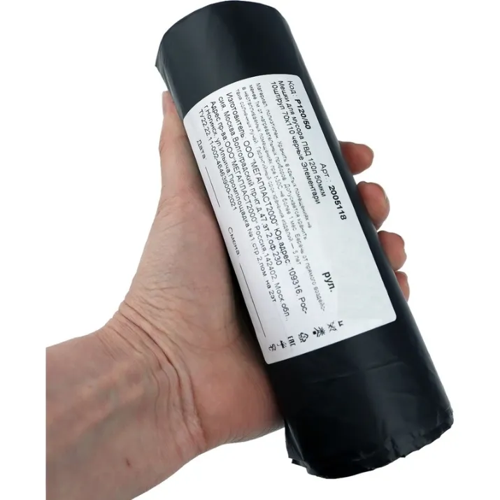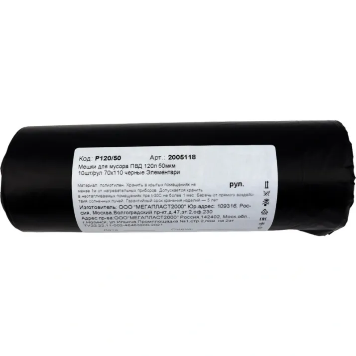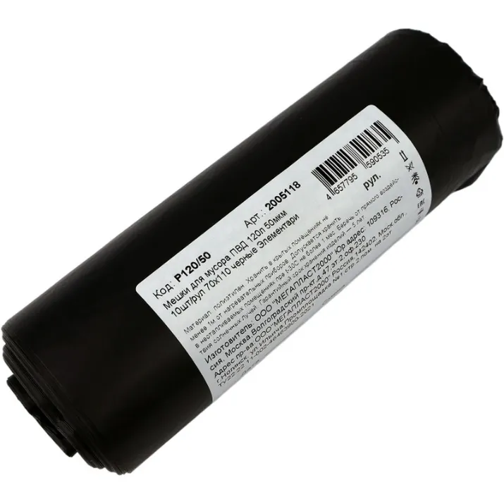 Мешки для мусора Элементари 120 л черные (ПВД 50 мкм). Предназначены для утилизации тяжелого мусора. Биоразлагаемые. Размер: 70×110 сантиметров. Тип упаковки: рулон. Тип дна: звездочка. Отличаются надежностью и прочностью.