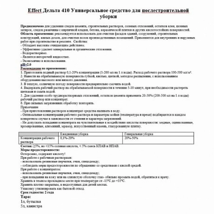 Способ применения: Приготовить водный раствор 0,1-20% концентрации (1-200 мл на 1 л воды). Нанести на обрабатываемую поверхность губкой, кистью, щеткой, методом распыления, с использованием оборудования высокого или низкого давления. При необходимости потереть. Хорошо промыть проточной водой.