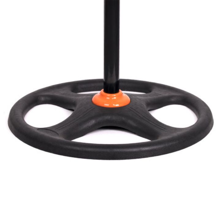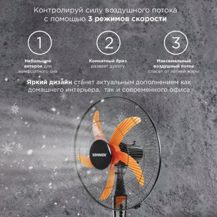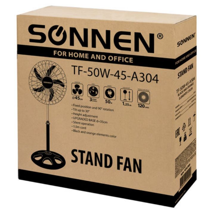 Вентилятор SONNEN TF-50W-45-А304 напольного типа привлекает внимание устойчивой конструкцией и стильным черно-оранжевым дизайном элегантного корпуса из металла и пластика.
