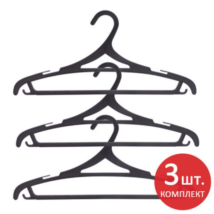 Вешалки изготовлены из качественного пластика. Предназначены для бережного хранения одежды. Обладают долговечностью и прочностью, не прогибаются под тяжелой верхней одеждой. Эстетичны, отлично вписываются в общий интерьер гардеробной. Размер модели составляет 43 см. 3 штуки в комплекте.