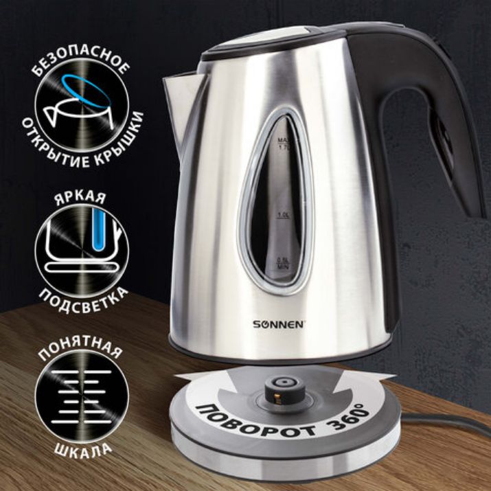 Чайник SONNEN KT-1721, 1,7 л, 2200 Вт, закрытый нагревательный элемент, нержавеющая сталь, черный, подсветка, 454347
