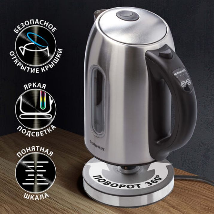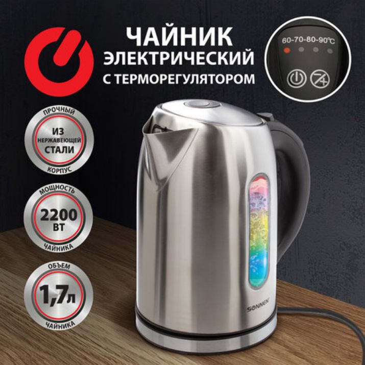 Чайник SONNEN KT-1740 отлично подойдет для дома и офиса. Он оснащен функцией выбора температуры нагрева и ее поддержания для приготовления самого вкусного чая. Корпус изготовлен из нержавеющей стали.