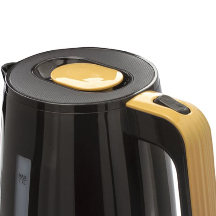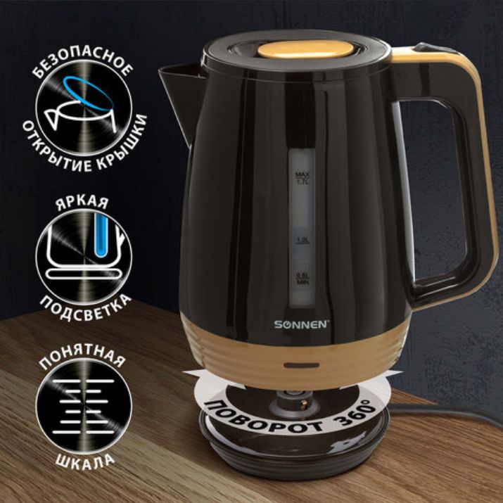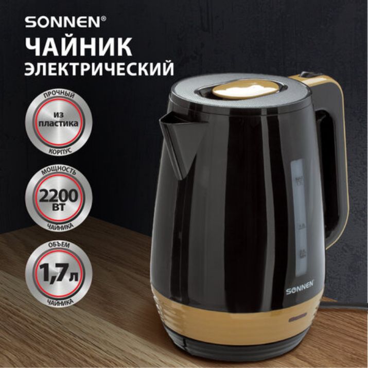 Чайник SONNEN KT-1776, 1,7 л, 2200 Вт, закрытый нагревательный элемент, пластик, черный/горчичный, 453418