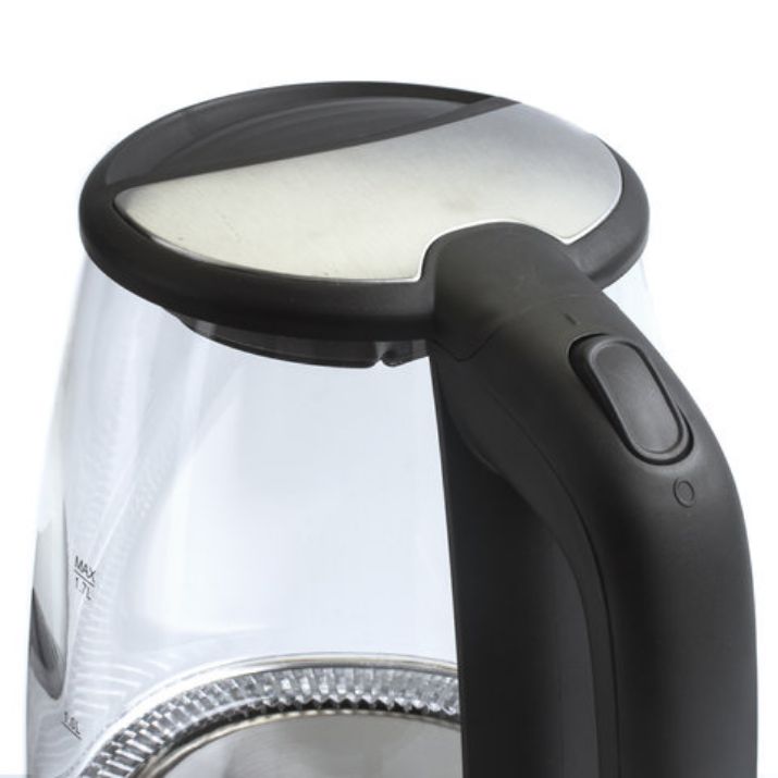 Мощность прибора составляет 2200 Вт, что позволит воде закипеть за считанные минуты. На крышке чайника находится кнопка открывания, что делает удобнее его эксплуатацию. Корпус изготовлен из термостойкого стекла. Скрытый нагревательный элемент увеличит срок службы. Индикатор уровня воды позволит с легкостью определить количество воды в чайнике. Сменный нейлоновый фильтр предотвратит попадание накипи в напиток. Автоотключение при недостаточном количестве воды и защита от перегрева делают данную модель безопасной в использовании. Безопасность данного чайника увеличивает пластиковая вставка на крышке. LED-подсветка проинформирует о том, что он включен, и процесс нагрева воды запущен. Шнур, при необходимости, можно спрятать в специальный отсек, расположенный в подставке.