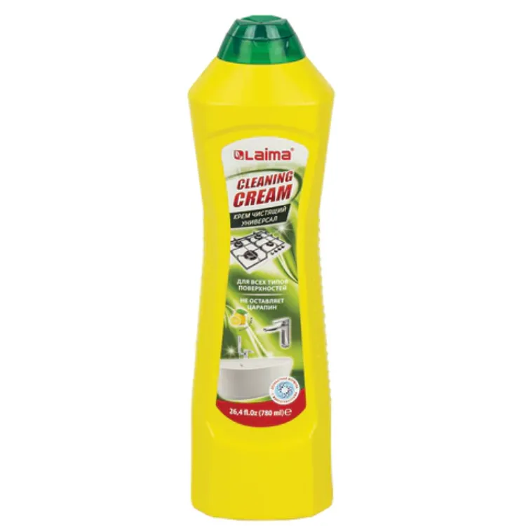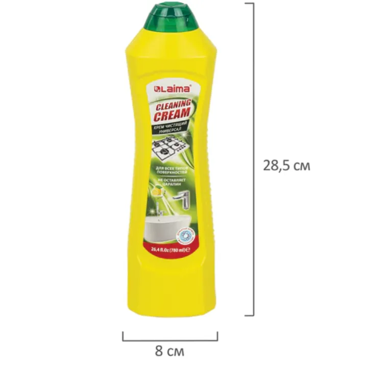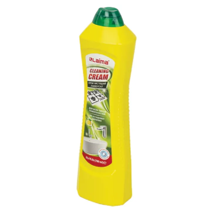 Благодаря специально разработанной формуле крем LAIMA PROFESSIONAL очищает и полирует раковину, плитку, ванную, кафель и кухонные предметы, не царапая их.