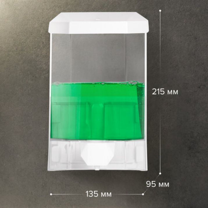 Дозатор из прозрачного пластика объемом 1 л обеспечивает высокую гигиеничность. Выдача мыла осуществляется экономичными порциями. Сочетается с расходными материалами других производителей. Имеется окно для контроля уровня мыла. Закрывается на пластиковый ключ. Размер – 215х135х95 см. Крепежные материалы в комплекте.
