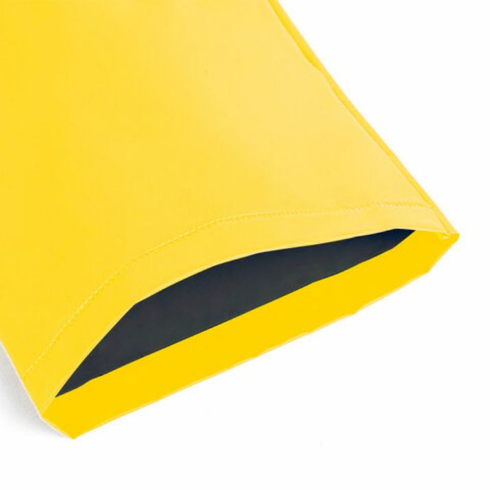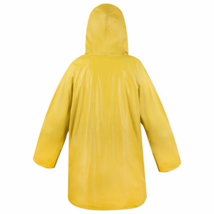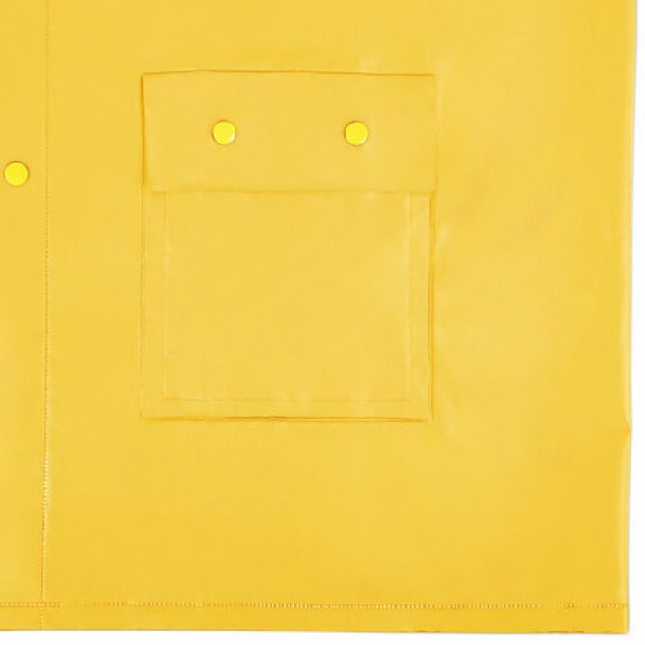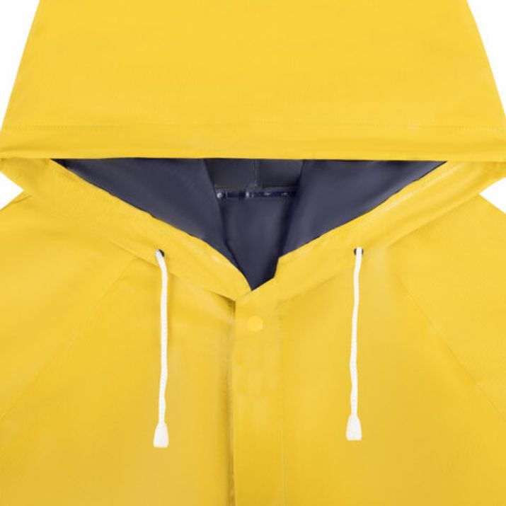 Дождевик-куртка универсального размера с капюшоном изготовлена из плотного водозащитного материала – поливинилхлорида (PVC). Застегивается на 4 пары кнопок из полипропилена (PP). В капюшоне есть кулиска с пластиковыми наконечниками. Карманы с влагозащитными клапанами на кнопках. Рукава сужаются книзу. Края рукавов, полочек и низ изделия подогнуты и надежно проклеены. Супер-прочный и стойкий материал. Для многоразового использования.
