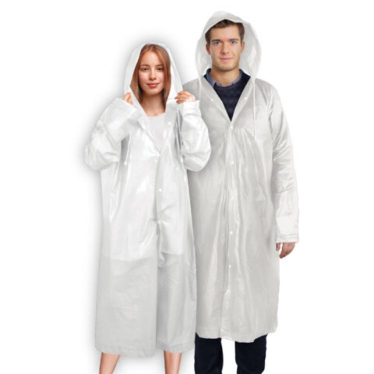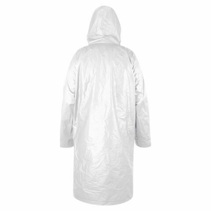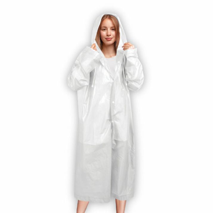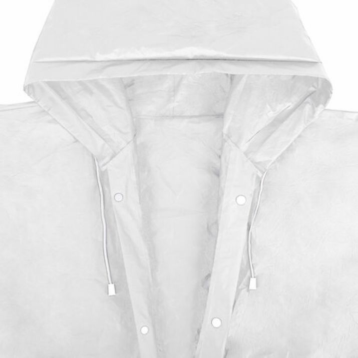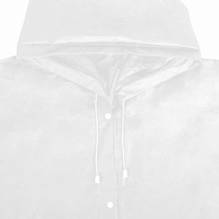 Дождевик-плащ универсального размера с капюшоном изготовлен из этиленвинилацетата (EVA). Поверхность дождевика рельефная. Застегивается на 6 пар кнопок из полипропилена (PP). В капюшоне есть кулиска с пластиковыми наконечниками.