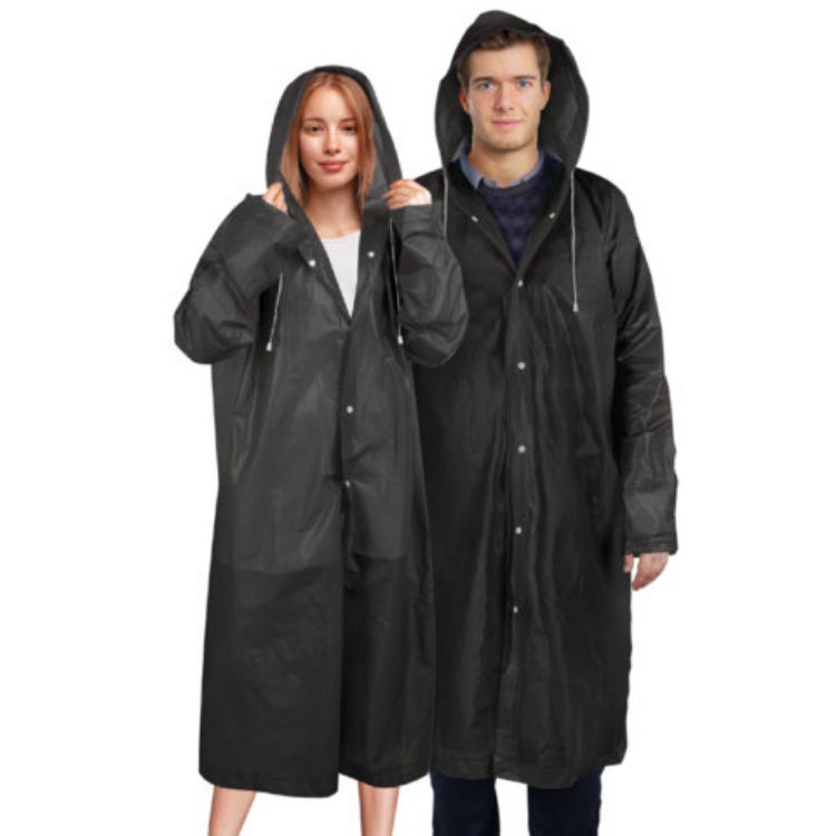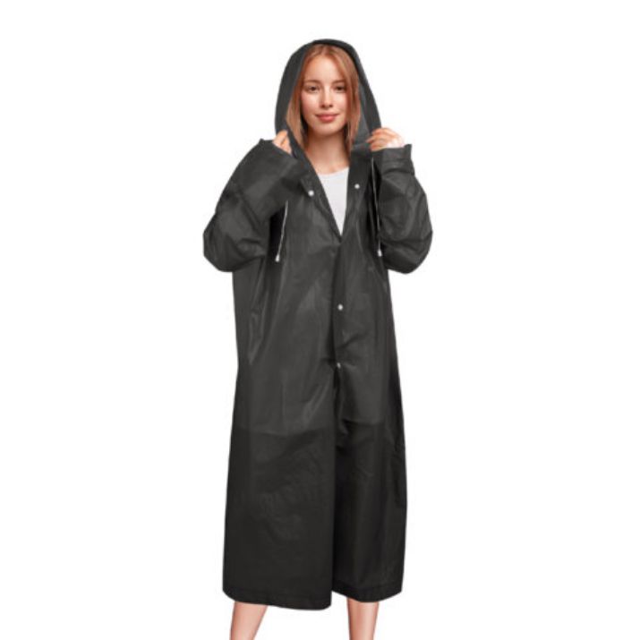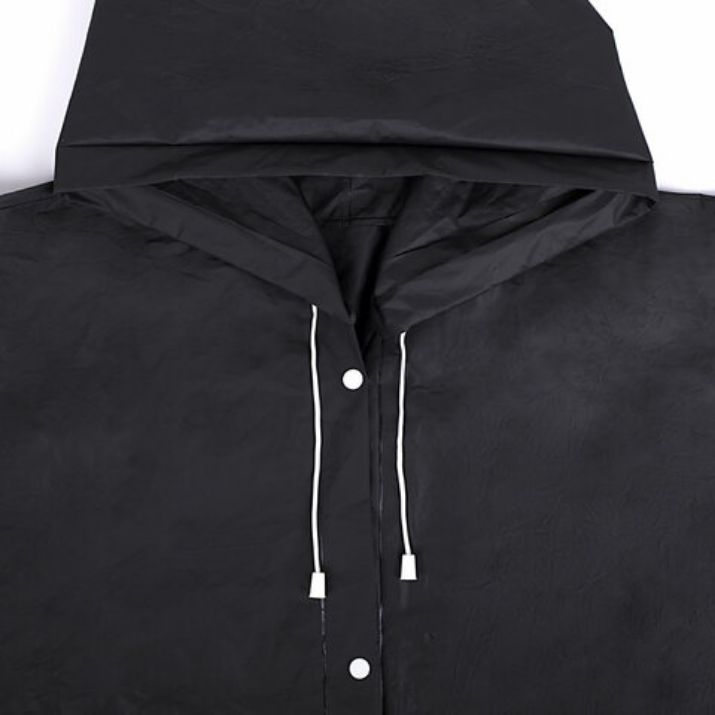 Дождевик-плащ универсального размера с капюшоном изготовлен из этиленвинилацетата (EVA). Поверхность дождевика рельефная. Застегивается на 6 пар кнопок из полипропилена (PP). В капюшоне есть кулиска с пластиковыми наконечниками.