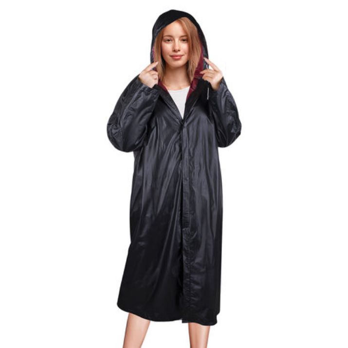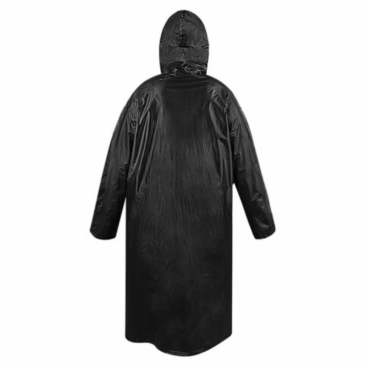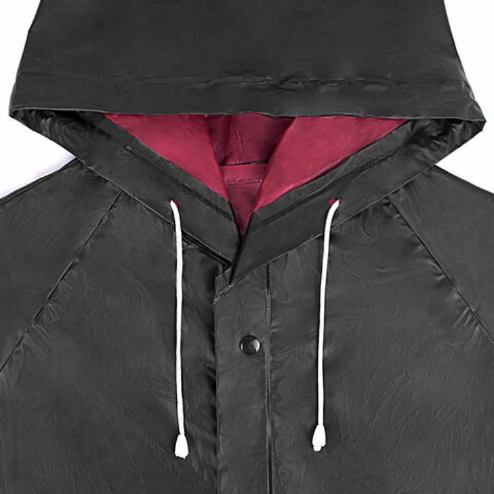 Дождевик-плащ универсального размера с капюшоном изготовлен из плотного водозащитного материала – поливинилхлорида (PVC). Застегивается на 6 пар кнопок из полипропилена (PP). В капюшоне есть кулиска с пластиковыми наконечниками.