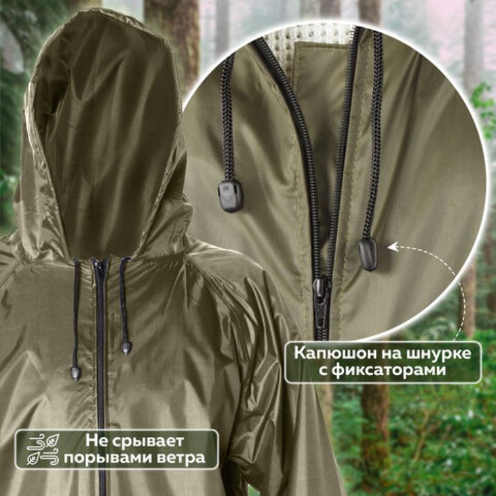Ветрозащитная планка, рукав реглан с приточной манжетой. Накладные карманы с влагозащитными клапанами. В нижней части пройм расположены два вентиляционных отверстия, оформленных люверсами. Низ изделия обработан в подгиб. Внешний край капюшона собран на кулису, в которую вставлен шнур с наконечниками и фиксаторами. Ткань таффета из полиэстера обладает хорошими ветрозащитными и влагозащитными свойствами, не промокает и не растягивается при намокании, устойчива к ультрафиолетовому излучению.