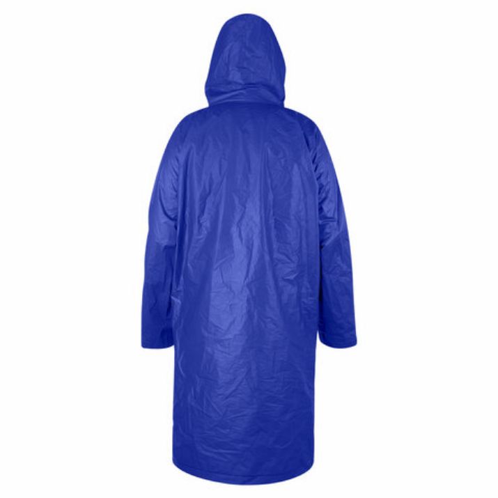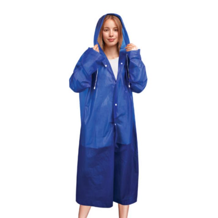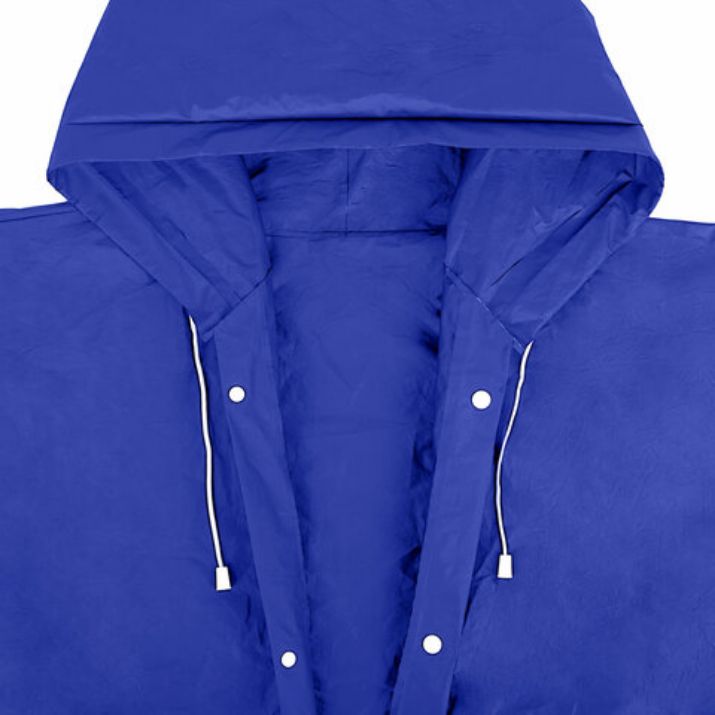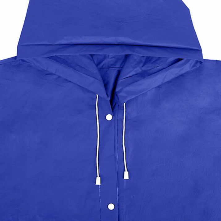 Дождевик-плащ универсального размера с капюшоном изготовлен из этиленвинилацетата (EVA). Поверхность дождевика рельефная. Застегивается на 6 пар кнопок из полипропилена (PP). В капюшоне есть кулиска с пластиковыми наконечниками.