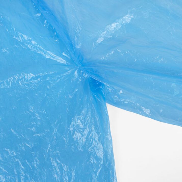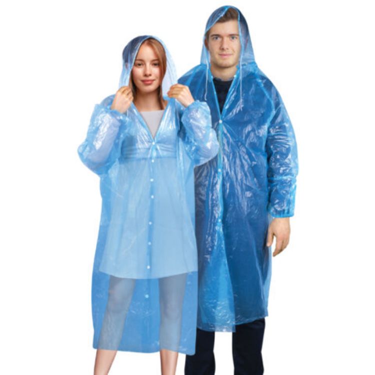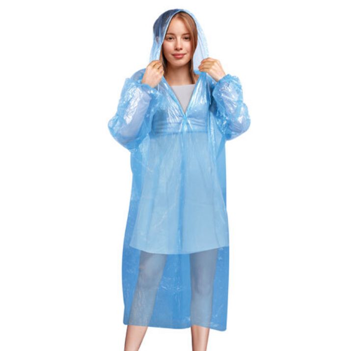 Дождевик-плащ универсального размера с капюшоном изготовлен из полиэтилена (PE). Застегивается на 4 пары кнопок из полипропилена (PP). В капюшоне есть кулиска с пластиковыми наконечниками. В рукава вставлены резинки для более плотного прилегания материала к запястью и предотвращения попадания влаги внутрь. Для многоразового использования.