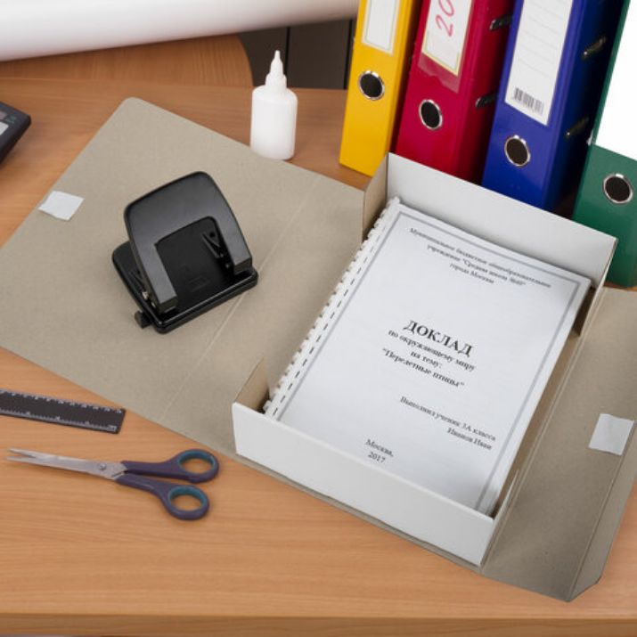 Изготовлен из переплетного картона толщиной 1,5 мм с покрытием бумвинил. Вмещает до 700 листов. Выдерживает до 4 кг. Размер короба - 33x8x24 см. Имеет откидную крышку и 2 хлопчатобумажные завязки. Поставляется в разобранном виде.