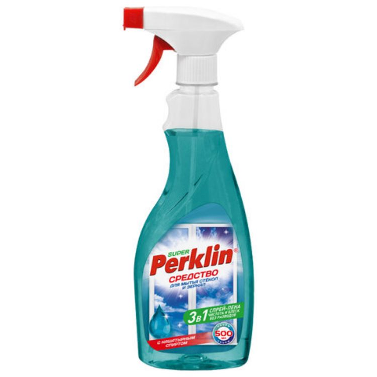 Средство для мытья стекол, зеркал и кафеля PERKLIN SUPER с нашатырным спиртом может быть использовано в виде пены или спрея. Эффективно для мытья оконных и автомобильных стекол, зеркал, кафеля, витрин, хрусталя, фарфора, для протирки экранов мониторов.