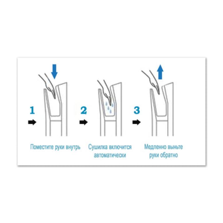 Руки становятся сухими за 7-10 секунд. Такой результат достигается благодаря высокой скорости воздушного потока и уникальной технологии подачи воздуха. Воздух подается со скорость 95 м/с, под определенным углом так, что он фактически сдувает капли воды с рук за считанные секунды!