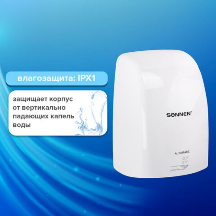 Мощность 1200 Вт обеспечивает время сушки рук за 15 секунд. Стандарт IPX1 гарантирует защиту от брызг. Включается и выключается сушилка автоматически при помощи инфракрасного сенсора. Пластиковый корпус в белом цвете впишется в любой интерьер. В комплект входит набор для монтажа: шурупы с пластиковыми дюбелями, кронштейн и шаблон установки для удобства разметки точек крепления.